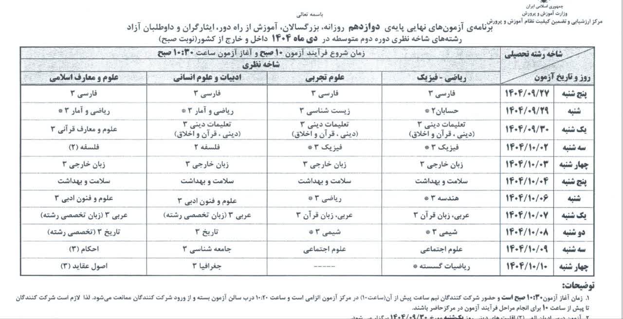 برنامه امتحانات نهایی دیماه 1404