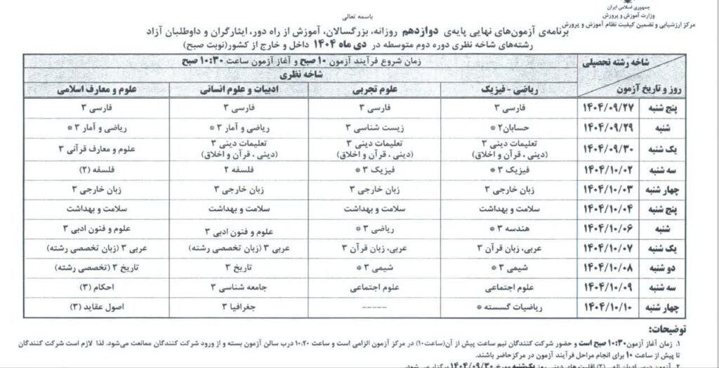 برنامه امتحانات نهایی دیماه ۱۴۰۴